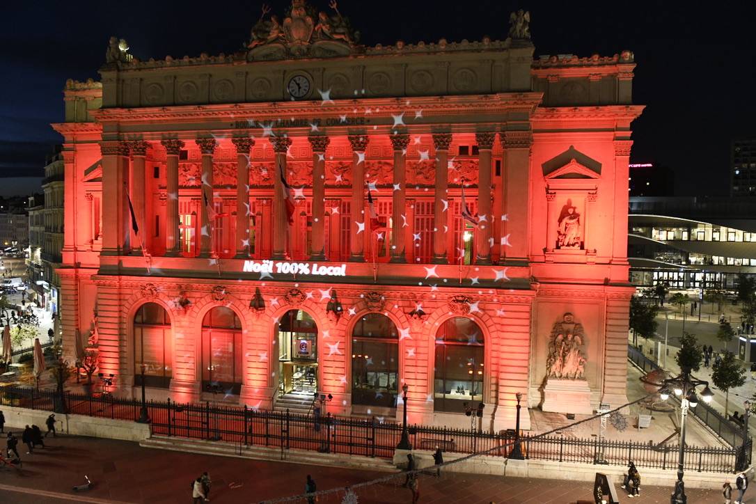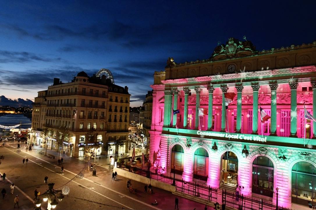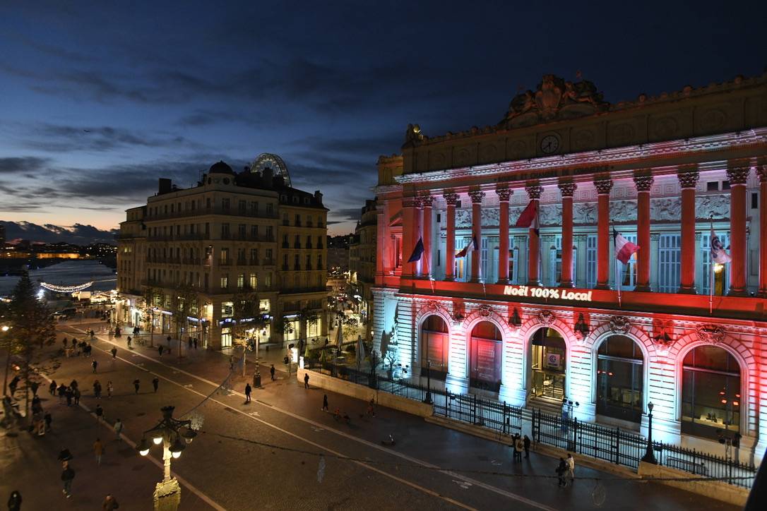 projecteurs architecturaux Nicols - Wash 600Pour une durée d'un mois, la CCIAMP a pu faire passer 5 messages forts en soutien aux commerçants Marseillais :