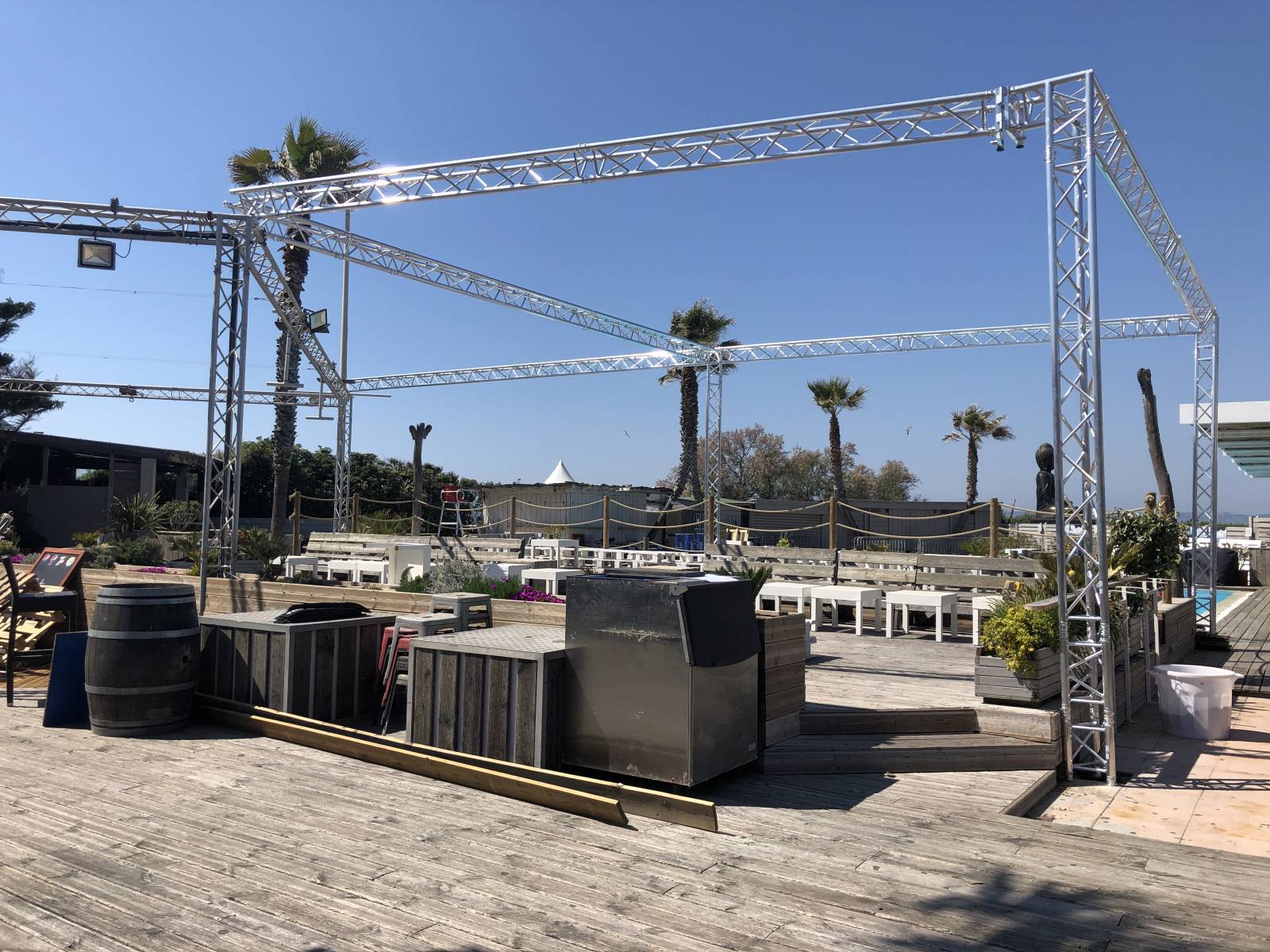 Au Sport Beach, nous avons pu réaliser la création d'un pont supplémentaire, avec la maintenance complète de l'installation, son, lumière, vidéo et électrique,