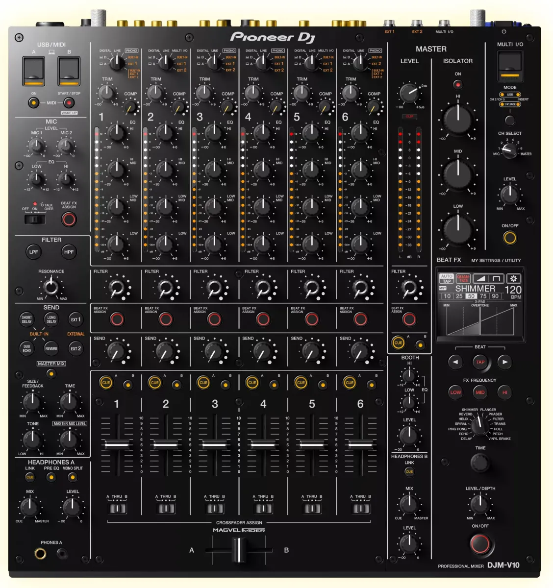 La Pioneer DJM-V10 est une table de mixage DJ professionnelle 6 canaux, conçue pour offrir une créativité maximale aux DJ et producteurs. Référence incontournable pour les clubs, festivals et événements haut de gamme, elle intègre une qualité audio exceptionnelle 64 bits, un processeur d’effets avancés et une connectique complète pour toutes les configurations.
